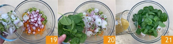 Ajoutez également l'oignon frais 19 et les jeunes pousses d'épinards, préalablement lavées et séchées 20, puis assaisonnez avec la sauce 21 et mélangez bien.