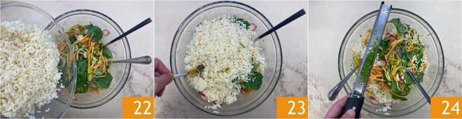 Ajoutez le riz 22 et mélangez encore 23, puis parfumez avec le zeste de lime râpé 24.