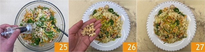 Enfin, ajoutez un tour de moulin à poivre 25 et les cacahuètes grillées 26. Un dernier mélange et votre salade de riz avec légumes et cacahuètes est prête à être dégustée 27 !