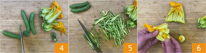 Séparez les fleurs des courgettes et équeutez-les 4, puis coupez-les également en julienne 5. Ouvrez délicatement les fleurs et retirez le pistil interne 6.