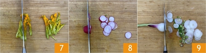 Coupez aussi les fleurs en fines lanières 7. Nettoyez et coupez en fines rondelles les radis 8 et l'oignon frais 9.
