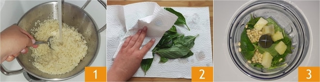 Pour réaliser la salade de riz végétarienne, commencez par cuire le riz al dente dans une grande quantité d'eau bouillante salée. Rincez-le sous l'eau courante pour arrêter la cuisson 1, puis laissez-le égoutter pendant au moins 30 minutes, en remuant de temps en temps. Entre-temps, préparez le pesto : rincez délicatement les feuilles de basilic et tamponnez-les avec du papier absorbant 2, puis mettez-les dans un mixeur avec l'huile, les fromages, les pignons et, si vous le souhaitez, l'ail 3.