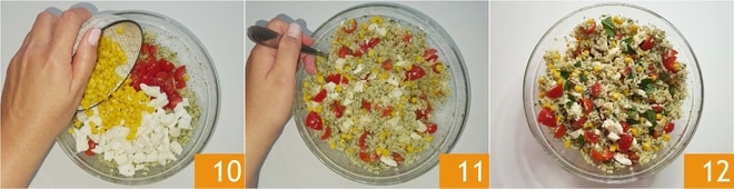 Ajoutez les tomates cerises, la mozzarella et le maïs égoutté 10. Mélangez bien le tout 11, puis rectifiez l'assaisonnement avec du sel et parfumez avec quelques feuilles de basilic. Votre salade de riz végétarienne est prête à être servie 12 !