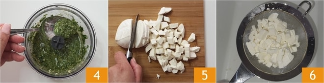 Mixez par intermittence jusqu'à obtenir une consistance crémeuse 4, puis transférez le pesto dans un bocal et placez-le au réfrigérateur jusqu'au moment de l'utilisation. Préparez également les autres ingrédients : coupez la mozzarella en dés 5 et laissez-la égoutter dans une passoire pour qu'elle perde son excès de liquide 6.