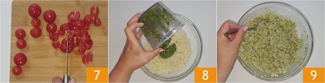Lavez les tomates cerises et coupez-les en 4 parties 7. Maintenant, transférez le riz dans un bol, ajoutez le pesto 8 et mélangez bien 9.