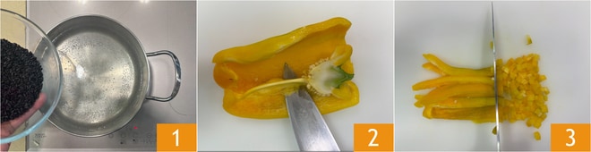 Pour préparer la salade de riz vénéré avec légumes et crevettes, commencez par cuire le riz vénéré dans de l'eau bouillante salée 1. Pendant ce temps, coupez les poivrons jaunes, retirez la tige, les graines et les filaments internes 2. Ensuite, coupez-les en lanières, puis en petits dés 3.