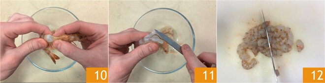 Maintenant, occupez-vous de nettoyer les crevettes. Coupez la tête, la queue et la carapace 10, retirez l'intestin 11 et coupez la chair en morceaux 12.
