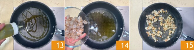 Versez un filet d'huile dans une poêle 13, ajoutez les crevettes 14, faites-les revenir pendant 1-2 minutes 15 et mettez de côté.