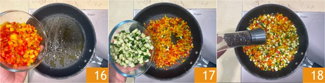Dans la même poêle, mettez les poivrons 16 et les courgettes 17. Assaisonnez de sel et de poivre 18 et faites sauter le tout.
