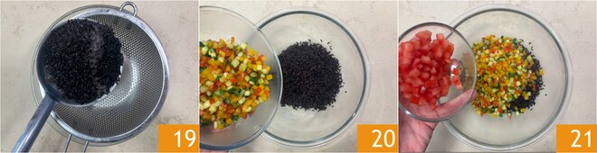 Égouttez le riz 19 et placez-le dans un grand bol. Laissez-le refroidir complètement. Ensuite, ajoutez les légumes sautés 20 et les tomates 21.