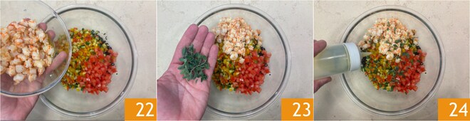 Ajoutez les crevettes 22, la marjolaine fraîche 23 et un filet d'huile 24.