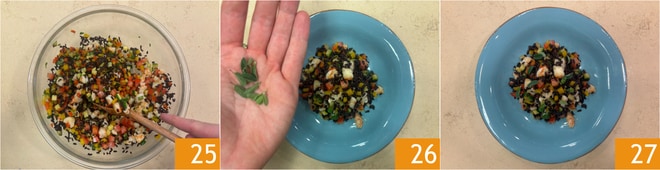 Mélangez le tout 25 et servez. Complétez avec quelques autres feuilles de marjolaine 26. La salade de riz vénéré avec légumes et crevettes est prête à être servie 27.