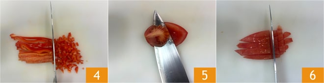 Faites la même chose avec les poivrons rouges 4. Coupez les tomates en deux et retirez les graines et la pulpe 5, puis réduisez-les en dés 6.