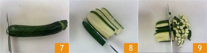 Coupez les extrémités des courgettes 7, tranchez-les 8 puis coupez-les en dés 9.