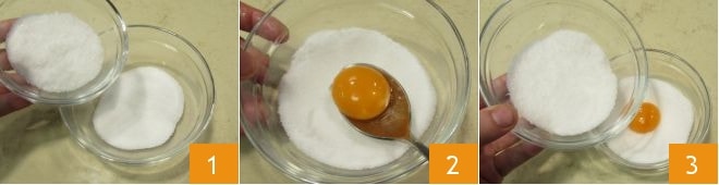 Pour réaliser la salade de spaghettis avec œuf mariné, il est conseillé de commencer la préparation la veille car l'œuf nécessitera plusieurs heures de marinade. Prenez 4 petits bols et dans chacun d'eux mélangez 50 g de sel avec 50 g de sucre 1 ; au centre, créez un petit puits. Cassez un œuf, prélevez le jaune, puis déposez-le délicatement dans le petit bol 2. À part, mélangez à nouveau 50 g de sel et 50 g de sucre et versez-les délicatement sur le jaune cru en veillant à le couvrir entièrement 3. Procédez de la même manière avec les autres jaunes.