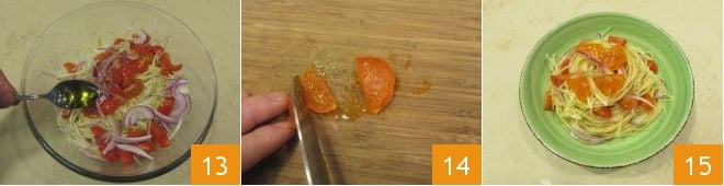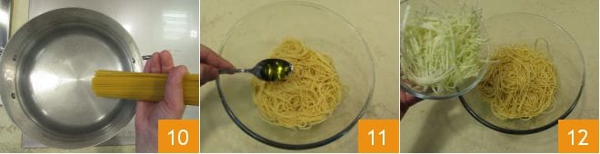 Quand l'eau bout, faites cuire les spaghettis pendant le temps indiqué sur l'emballage 10, à la fin de la cuisson, égouttez les spaghettis dans un saladier, assaisonnez-les avec l'huile d'olive pour éviter que les pâtes ne collent en refroidissant 11 et mélangez, ajoutez ensuite le chou émincé 12,