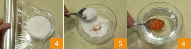 Couvrez le petit bol avec du film alimentaire transparent 4, laissez mariner les jaunes dans les 4 petits bols pendant 15 heures à température ambiante. Une fois le temps de marinade écoulé, avec une cuillère, retirez délicatement la marinade superficielle de sel et de sucre en faisant très attention à ne pas casser le jaune 5. Sortez tous les jaunes qui seront fermes, rincez-les rapidement et délicatement dans un bol d'eau à température ambiante 6. Puis égouttez-les et placez-les dans un bol au réfrigérateur jusqu'au moment de l'utilisation.