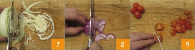 Entre-temps, mettez sur le feu une casserole avec beaucoup d'eau : elle servira à cuire les pâtes. Une fois l'ébullition atteinte, salez. Pendant ce temps, lavez le chou de ses feuilles extérieures, divisez-le en deux et émincez-le finement 7, épluchez l'oignon et émincez-le également 8, enfin lavez les tomates cerises et coupez-les en quartiers 9.