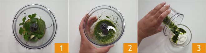 Pour préparer la salade de thon, commencez par la vinaigrette : dans un mixeur, mettez les feuilles de basilic, de menthe et de persil, la gousse d'ail pelée, l'huile, une pincée de sel 1 et mixez le tout 2. Aromatisez avec la sauce aromatique le yaourt grec 3.