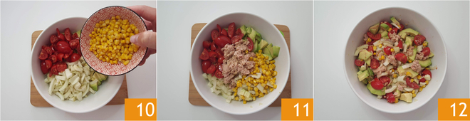 Réunissez tous les ingrédients dans un bol 10, ajoutez également le maïs 10 et le thon 11, salez, poivrez et mélangez 12. Accompagnez la salade de thon avec la sauce au yaourt.