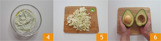 Mélangez 4 et gardez au frais jusqu'au moment de servir. Prenez le fenouil, coupez la base puis les tiges, tranchez-le finement 5. Prenez l'avocat, coupez-le en deux dans le sens de la longueur 6 en tournant autour du noyau qui se trouve au centre du fruit. Avec une cuillère, retirez le noyau.
