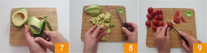 Enlevez la peau de l'avocat 7 et coupez-le en petits morceaux 8. Prenez les tomates cerises et coupez-les en 4 parties 9.