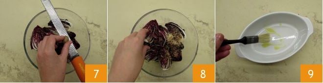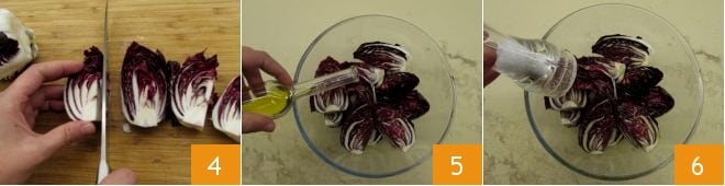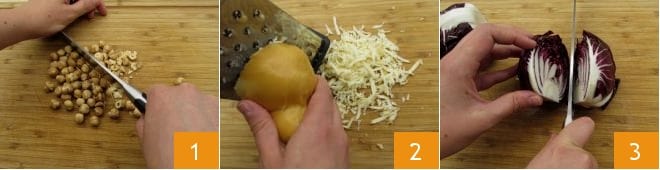 Pour préparer la salade gratinée de radicchio, noisettes et scamorza, commencez par hacher les noisettes 1 et râper la scamorza 2. Lavez, retirez la base et les feuilles extérieures, puis coupez le radicchio en deux 3;