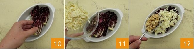 Répartissez les quartiers de radicchio à l'intérieur 10. Saupoudrez la surface avec la scamorza râpée 11, répartissez également les noisettes 12