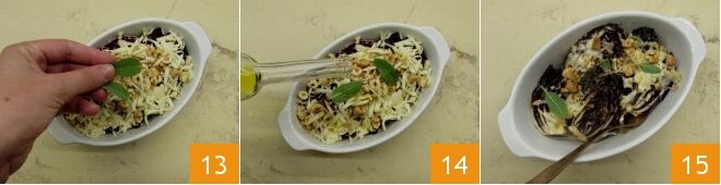et quelques feuilles de sauge 13. Huilez à nouveau la surface 14, puis passez au four préchauffé en mode grill à 220° pendant 5 minutes, le temps de faire gratiner le fromage et griller les noisettes 15. Dégustez votre salade gratinée de radicchio, noisettes et scamorza bien chaude.