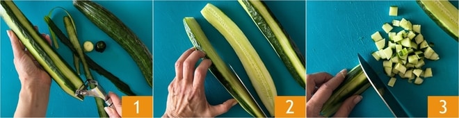 Pour préparer la salade Shirazi, commencez par les légumes : équeutez les concombres, puis pelez-les en alternance avec un économe 1. Coupez-les en deux dans le sens de la longueur 2 et enlevez les graines centrales, puis coupez-les en petits cubes 3.