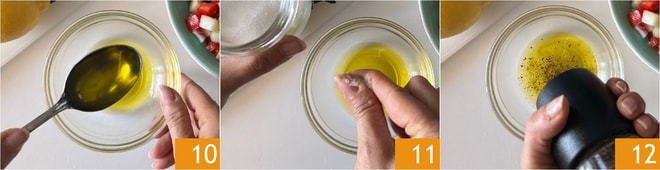 Passez à l'assaisonnement : versez l'huile dans un petit bol 10, salez 11 et poivrez 12.