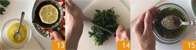 Ajoutez le jus de citron 13, puis hachez le persil et le basilic 14. Ajoutez les herbes hachées et la menthe sèche 15 et émulsionnez le tout.