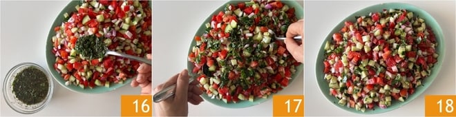 Répartissez l'assaisonnement sur la salade 16 et mélangez bien 17. La salade Shirazi est prête à être servie 18 !
