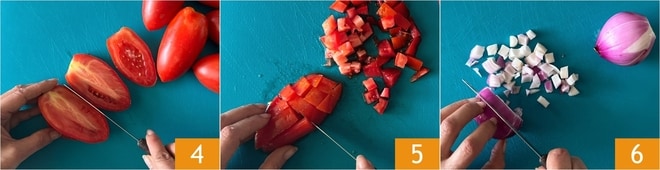 Coupez également les tomates en deux 4 et coupez-les en cubes après avoir enlevé les graines 5. Épluchez et coupez l'oignon en cubes 6.