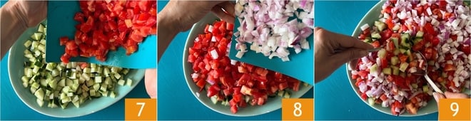 Transférez les concombres dans un plat de service avec les tomates 7 et les oignons 8, puis mélangez bien 9.