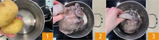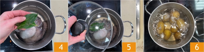 Plongez complètement le poulpe, ajoutez les feuilles de laurier 4 et couvrez avec un couvercle 5. Laissez cuire à feu moyen pendant environ 60 minutes. Lorsque les pommes de terre seront cuites 6, égouttez-les et laissez-les tiédir.