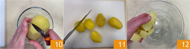Occupez-vous des pommes de terre : épluchez-les 10 ; coupez-les également en cubes de 2-3 cm 11 et au fur et à mesure, rassemblez-les dans un bol 12.
