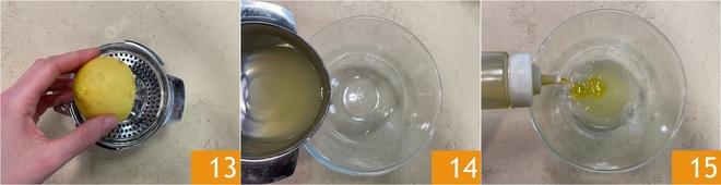 Préparez maintenant la sauce. Pressez le jus de citron 13 et transférez-le dans un bol 14. Ajoutez l'huile d'olive extra vierge 15.