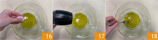 Ajoutez ensuite aussi le sel 16 et une pincée de poivre noir 17. Battez bien avec une fourchette pour obtenir une émulsion stable 18.