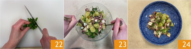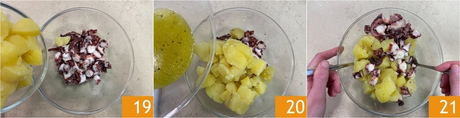 Composez maintenant la salade. Versez les pommes de terre dans le bol avec le poulpe 19, ajoutez l'assaisonnement fraîchement préparé 20 et mélangez bien 21.