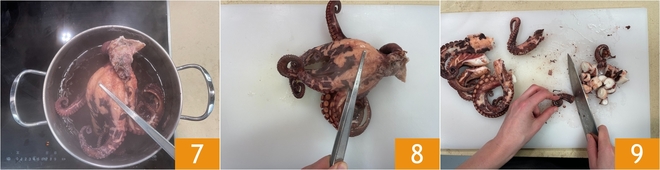 Dès que le poulpe sera également cuit, égouttez-le 7 et transférez-le sur une planche à découper 8. Coupez-le ensuite en morceaux 9 et transférez-le dans un grand bol.