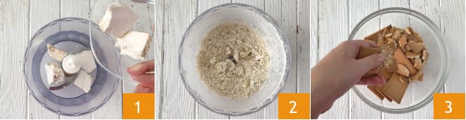 Pour préparer le saucisson au chocolat et au nougat, commencez par verser les morceaux de nougat dans un mixeur 1 et hachez-le pendant quelques secondes à pleine vitesse 2, puis cassez grossièrement les biscuits secs avec vos mains 3.