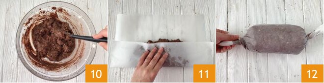 Mélangez avec une cuillère jusqu'à obtenir un mélange homogène 10. Versez le mélange obtenu au centre d'une feuille de papier sulfurisé, soulevez le bord inférieur 11 et roulez-le jusqu'à l'envelopper complètement, puis torsadez les extrémités pour sceller le cylindre 12. Laissez raffermir au réfrigérateur pendant au moins 6 heures, ou mieux toute la nuit. Vous pouvez également le mettre au congélateur pendant quelques heures.