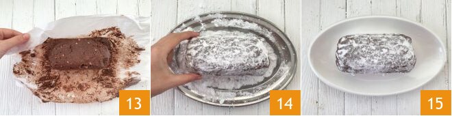 Après le temps de refroidissement, retirez le papier sulfurisé 13 et recouvrez le saucisson de beaucoup de sucre glace 14. Votre saucisson au chocolat et au nougat est prêt à être servi 15!