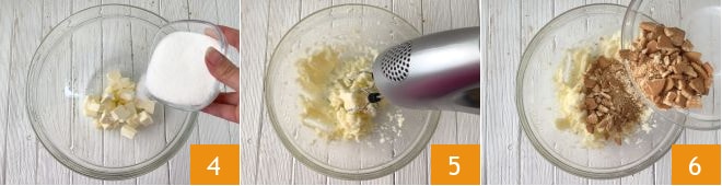 Dans un bol, mettez le beurre mou avec le sucre 4 et travaillez avec un batteur électrique pour obtenir un mélange crémeux 5, puis ajoutez les biscuits cassés 6.