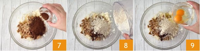 Ajoutez aussi le cacao amer 7, le nougat haché 8 et les œufs 9.