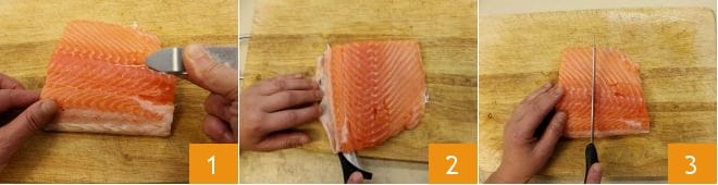 Pour préparer le saumon glacé au miel, commencez par nettoyer le poisson. En passant bien le bout des doigts sur la chair du saumon, vérifiez la présence d'arêtes résiduelles et retirez-les éventuellement avec une pince de cuisine 1. Coupez la partie la plus épaisse du filet 2, retirez la peau, puis divisez le saumon en 4 tranches de 150 g chacune 3.