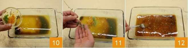 Et ajoutez le zeste râpé des agrumes 10 avec les feuilles de thym 11; assaisonnez de sel et de poivre à votre goût puis mélangez bien avec une fourchette 12.