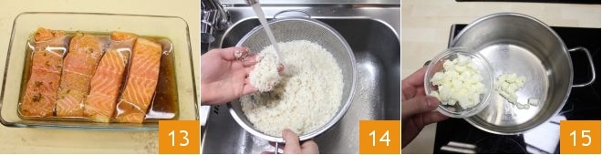 Déposez les tranches de saumon côte à côte dans la marinade 13 et placez-les au réfrigérateur pour mariner environ 30 minutes, couvertes de film plastique. Pendant ce temps, vous pouvez préparer le riz pilaf : mettez sur le feu une casserole avec beaucoup d'eau salée (qui servira à préparer le bouillon de légumes) et entre-temps, rincez plusieurs fois le riz sous l'eau froide courante pour qu'il perde son amidon 14. Dans une grande casserole, faites fondre le beurre coupé en morceaux 15