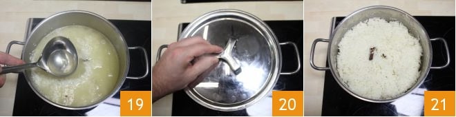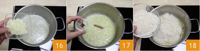 et faites suer l'oignon finement haché pendant au moins 8-10 minutes 16. Lorsque l'oignon devient translucide (il ne doit pas se colorer), ajoutez également la cannelle et les clous de girofle 17. Faites revenir pendant 2 minutes, puis ajoutez le riz lavé et égoutté 18 et faites-le griller pendant encore 5 minutes.